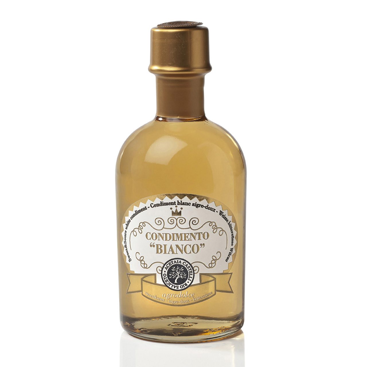 “BIANCO” balsamic condiment is made with 65% of concentrated white grape must, 35% of white wine vinegar. It’s a young product quickly aged in virgin barrels for balancing the color and taste. The acidity is only 5% that is perfect fresh summer salads. Available in 100, 250, 500 and 750 ml formats.